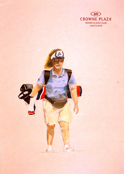 Following a short course in method acting (to learn how to inhabit the mind of an 18 year old fan), 18 Holes with Fanny is a series of drawings of Fanny Sunesson - a female professional Golf Caddy (formerly for Nick Faldo).The logoed paper is from golf hotels around the world. Over 18 holes, the series tracks a teenage fan's obsession with Fanny at work both in the limelight and in the background.